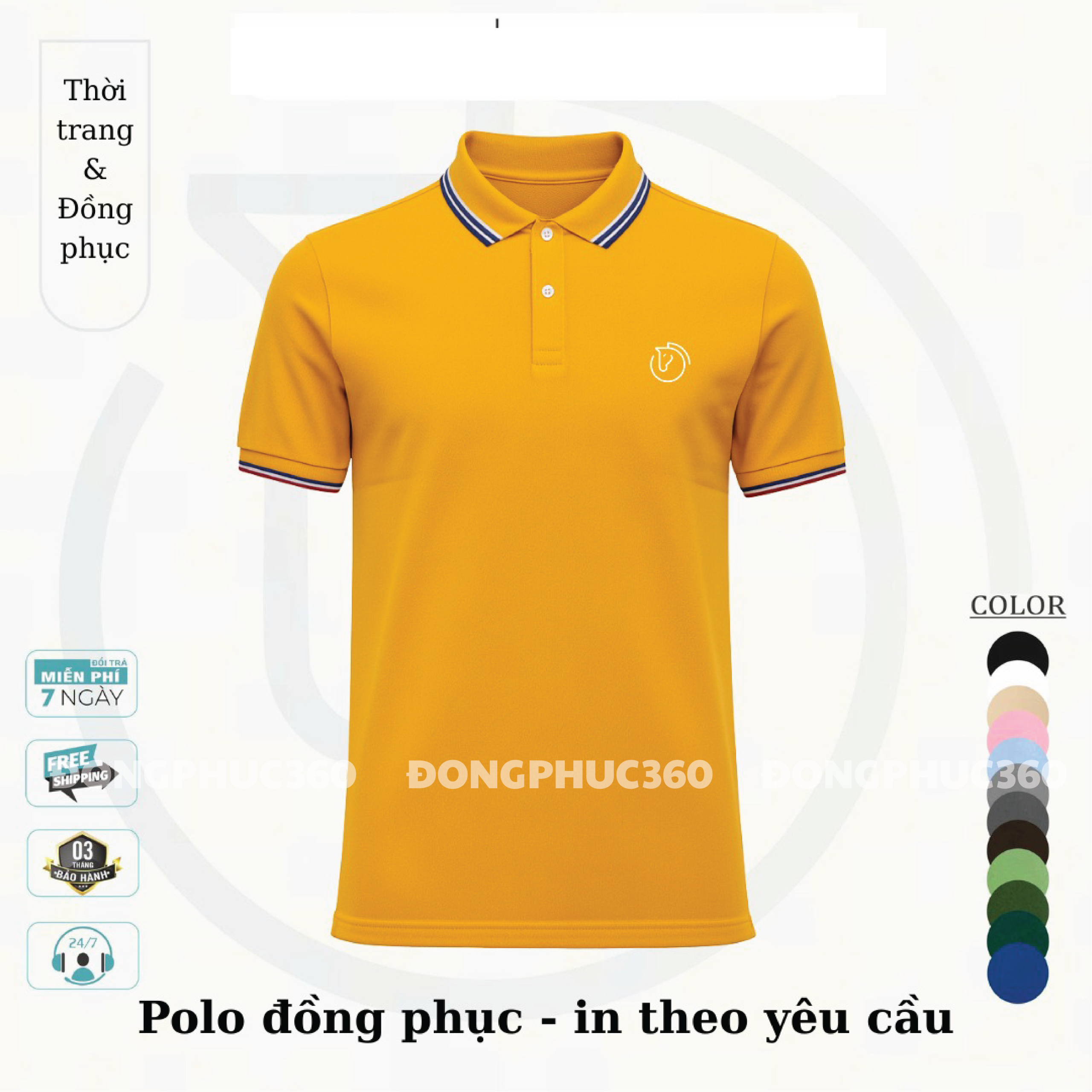 Mẫu áo polo trong hình sử dụng tông vàng nổi bật, phối cổ và tay áo màu xanh đậm, tạo cảm giác trẻ trung nhưng vẫn lịch sự. Thiết kế cổ bẻ truyền thống giúp người mặc trông gọn gàng, chuyên nghiệp, phù hợp cho: